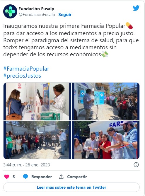 «Esta farmacia es la primera de una red de establecimientos que se desplegarán por diferentes territorios, sin discriminación por estrato socioeconómico ni el sistema de previsión al que se esté suscrito, y con el horizonte claro de acercar el sistema de salud a la gente, sin pensar en el negocio ni el lucro», agregó Muñoz.