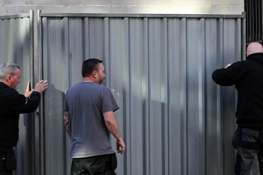 Trabajadores terminan de cubrir con un muro metálico el mural urbano de Banksy afuera de la sede de los Tribunales Reales, en Londres.Imagen: Justin Tallis/AFP